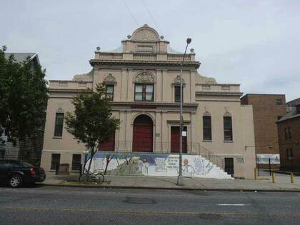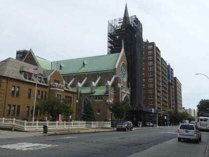 Parsons Blvd. reaches its southern end in a thicket of churches. The Presentation of the Blessed Virgin Mary Roman Catholic Church at Parsons Blvd. and 89th Ave., built in 1922, features some extraordinary entablatures above its secondary entrances depicting the three members of the Holy Trinity. The congregation was organized in 1886, and the first church on the site constructed in 1894. The bell tower was shrouded in construction netting when I visited, but the rehab was completed by the fall.