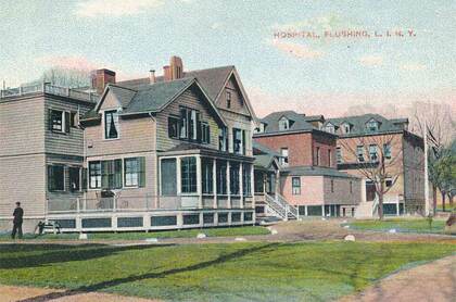 Historical information about Flushing Hospital is sketchy. It was founded in 1883 by “community-minded women” in Flushing “who set up a room with one bed in a rented house.” This postcard from the era on Forest, now 45th, Ave. presumably shows the house. The hospital expanded over the years to encompass a complex bounded by Parsons Blvd., Burling St., Delaware Ave. and 45th Ave.