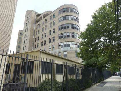 This round-ended building on Parsons Blvd. south of Union Turnpike is the “T building” of Queens Hospital Center (nee Queens General Hospital) and was originally known as Triboro Hospital, a tuberculosis treatment facility, built c. 1939-1940. With its airy wings and sun-drenched balconies, it was intended for the then-favored treatment of tuberculosis, plenty of fresh air and light. It’s similar in architecture to city hospital pavilions constructed on Welfare Island, the old Goldwater Hospital and North Brother Island (Riverside Hospital), now both demolished or in ruins.