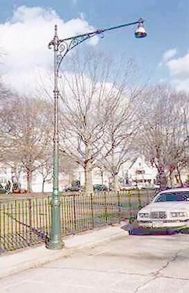 My interest in bicycling this drive as a kid, and into adulthood, was that it harbored 4 or 5 Type G “Corvington” lampposts, that gradually deteriorated through the years. They’d been equipped with “Gumball” luminaires but gradually the reflector bowls fell off and the lightbulbs weren’t replaced. Amazingly, though, they survived till about 1999 or 2000, when they were finally torn down, but not till after I got a couple of shots.