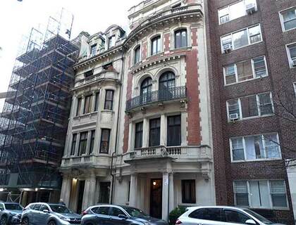 The joyously Beaux Arts #7 East 88th Street, partially covered by scaffolding, was built in 1902 as three separate residences. In 1905, #7 was purchased by distinguished attorney James C. Carter, who promptly fell ill and died nine months after moving in at 77. It was then purchased by Edward Charles Schaefer, president of the Germania Bank (a graffiti-scarred former Germania Bank branch at the Bowery and Bleecker St. was the home of photographer Albert Maysles and his family for years).