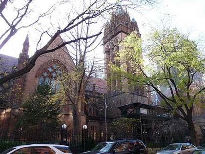 In a part of town I explore sparingly it’s fun to find massive edifices with long histories of which I was previously unaware, such as the massive, French Gothic Church of the Holy Trinity, #136-332 East 88th, designed by Barney & Chapman and built as a complex with its parish house from 1896-1899. It’s hard to get a complete exterior photo since it is set back from the street and fronted by street trees. A plaque gives a succinct history: but the plot was previously in the Rhinelander family since 1798, hence that date on the cornerstone. Serena Rhinelander donated the land in honor of her father and grandfather, with the congregation moving from its original location here in 1899.