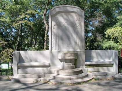 The west end of W. 116th Street at Riverside Dr. is marked by the Women’s Health Protective Association Fountain, installed in 1909, Bruno Louis Zimm, sculptor. The fountain consists of a stele with a fountain in front, with two marble benches on the side inscribed with the names of WHPA founders and associates. Charlotte Wilbour, whose name is on the bench, helped found the first New York City Woman Suffrage Association in 1870; it was among the first organization to agitate for female voting rights, which came to fruition in 1920.