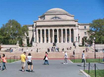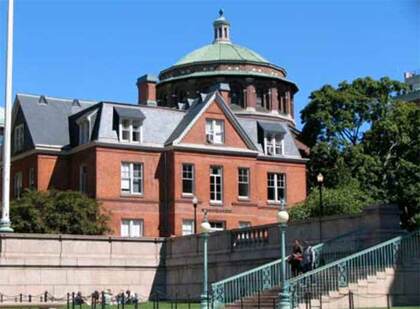The Low Memorial Library was a charter member of Columbia University, completed in 1897 by Charles McKim. It was named for the father of Brooklyn mayor, then Columbia president, then NYC Mayor Seth Low (1850-1916), merchant A. A. Low. It’s become a ceremonial space in recent decades. Ten Ionic columns to the Butler’s 14. There was a rowing track and canvas tank for Columbia’s crew in the basement. At its entrance steps, Daniel Chester French’s Alma Mater (1903) greets students, faculty and passersby. Currently bronze-colored, she’s been gilded in gold and green with verdigris during the years. Protesters unsuccessfully tried exploding her in 1970.
