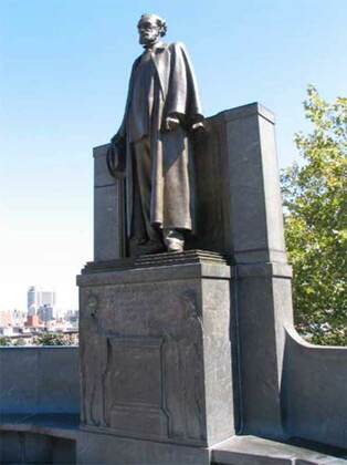 W. 116th comes to a halt once again at Morningside Dr., overlooking Morningside Park. It would have to descend a steep angle if it were to be run through here, so 19th-century engineers and surveyors didn’t even try. This dramatic setting is marked by Karl Bitter/Henry Bacon’s 1913 Carl Schurz monument, honoring the mid-19th-century German immigrant (1829-1906) who became a Civil War general, U.S. Senator from Missouri (1869-1875), President Rutherford Hayes’ Secretary of the Interior (1877-81), and editor of the New York Tribune and Harper’s Weekly.