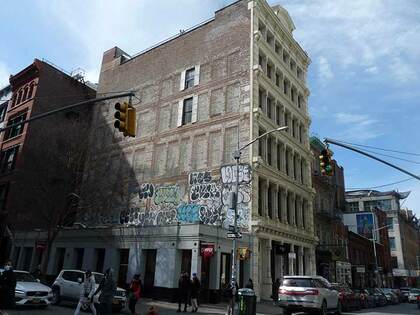 #112-114 Prince St. is a relatively late cast iron front constructed in 1882. Walking down Prince and in Soho in general, it’s hard to believe that before the 1980s it was relatively rundown, with small manufacturers and businesses with just a few galleries, but later took off as a high rent area with expensive retail. The fact that many streets have kept their Belgian block pavement and there are still original cast iron building fronts—and a few early-1900s cast iron lampposts—suggests that this area was overlooked for upkeep in NYC in the budget crises of the mid- and late-1900s. Note the Richard Haas trompe l’oeil building front with two real windows (fading now, unfortunately) and the low building on the corner, built in 1966 before landmarking forbade any new construction.